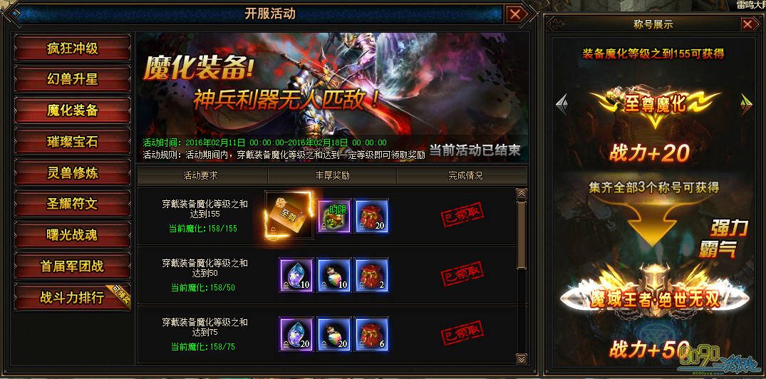 活动开启时间为开服1-7天,当玩家穿戴装备魔化等级之和达到50、75、100、125、155可领取对应奖励(每人每阶段限领1个)