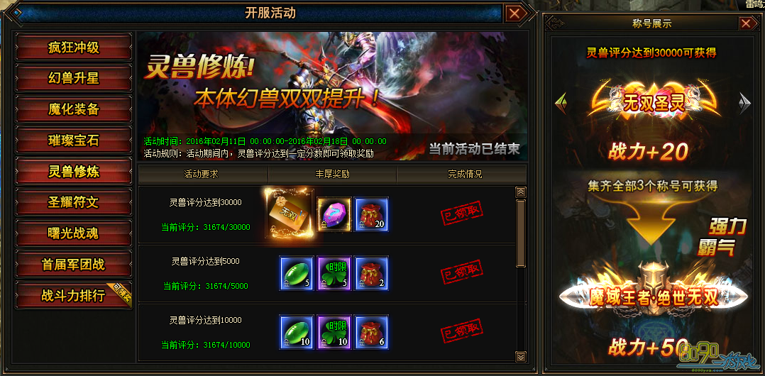 活动开启时间为开服1-7天,当玩家灵兽总评分达到5000、10000、16000、22000、30000可领取对应奖励(每人每阶段限领1个)