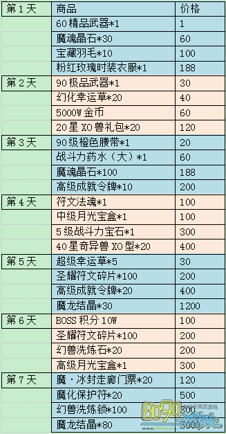 90级奖励:100绑定魔石、魔魂晶石*10、2倍经验药水*1