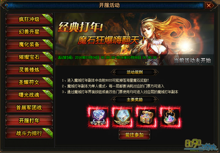 时间:开服第4-7天开启。开启后点击前往参加可打开魔域打年界面,或者直接点击单独的活动图标“魔域打年”图标进行打年界面。打年可概率获得海量魔石。
