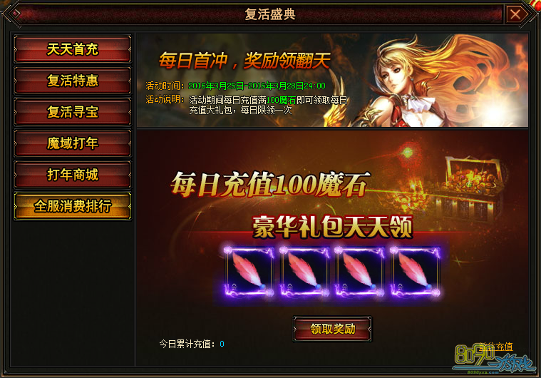 活动期间每日充值100魔石即可获得每日充值奖励。每日限领1次。