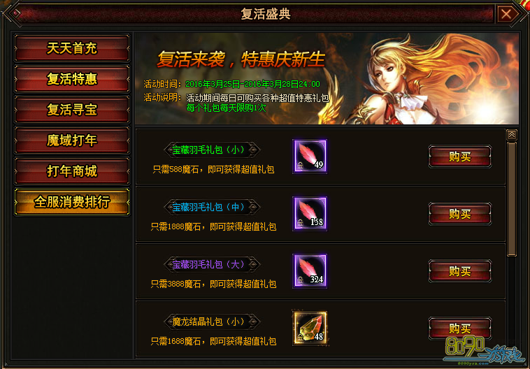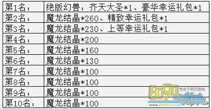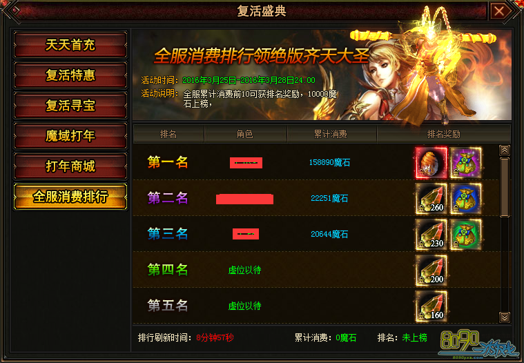 活动期间全服(跨服形式)消费排行榜的前10名可获得消费排行奖励,奖励在活动结束后统一邮件发放