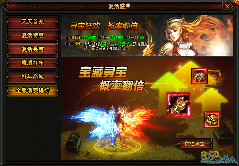 活动期间寻宝寻到魔龙装、霜炎爱神的概率翻倍。
