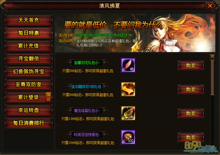 活动期间每日可购买各种特价礼包,每个礼包每日限购1次。