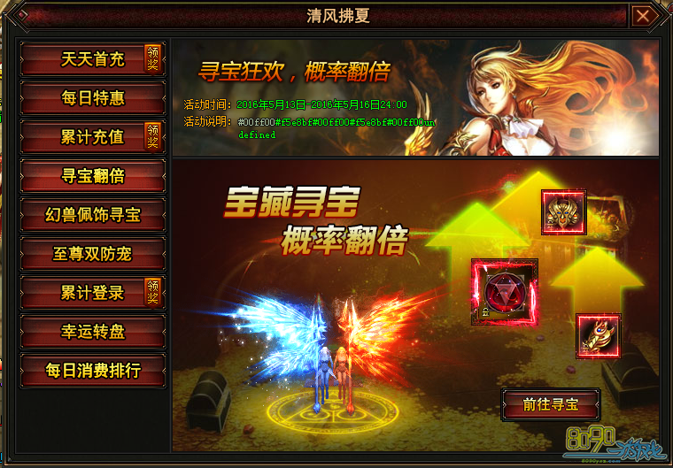 活动期间装备寻宝、幻兽寻宝抽中魔龙装、冰火爱神的概率翻倍,且可抽中进阶道具:魔龙神石