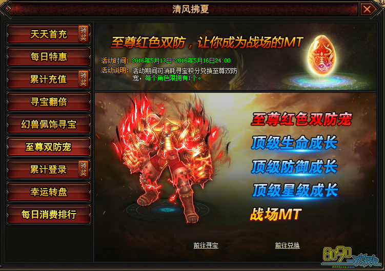 活动期间可消耗寻宝积分兑换幻兽:至尊红色双防宠。每个玩家限拥有1个,已经拥有的玩家不可再次兑换。点击“前往兑换”可打开界面兑换红色双防宠。