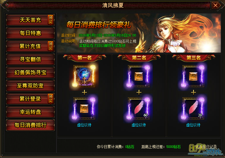 每日消费达5000钻石可上榜。