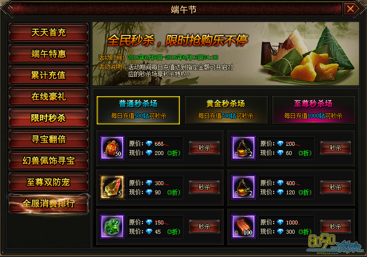 活动期间每日充值满500钻、700钻、1000钻可分别进入普通秒杀场、黄金秒杀场、至尊秒杀场参加秒杀活动。秒杀价格分别为2-3折。