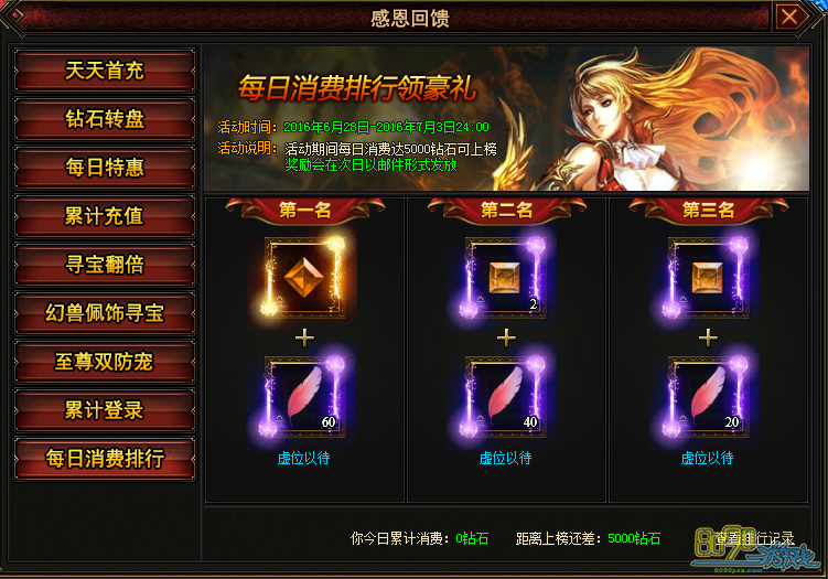 活动期间每日消费排行前3名可领取每日消费排行奖励