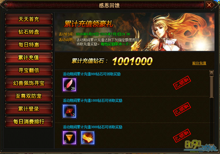 活动期间累计充值达到指定额度可领取累计充值奖励