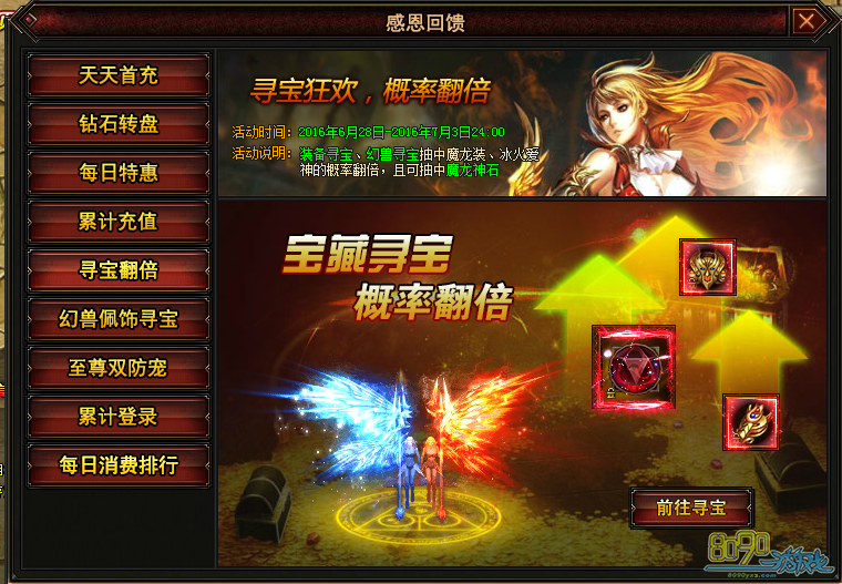 活动期间装备寻宝、幻兽寻宝、幻兽佩饰寻宝获得魔龙装、冰火爱神、幻兽佩饰的概率大幅提升,并可通过装备寻宝获得魔龙神石。