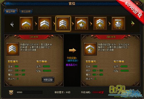进入游戏之后,每个玩家都会获得属于自己的官位,玩家只有不断提升自己的官位,才能变得更加强大。首先,官位都是从一阶步兵开始,每次提升官位都是有一定的要求的,而主要的要求就是等级达到要求,以及威望值达到要求。才能提升一次官位哦。