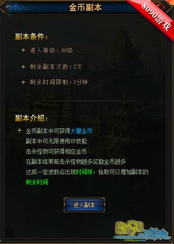 小编就不卖关子了,赚钱的副本就是金币副本啦。只要等级达到80级每天就有两次进入金币副本的机会,每次副本刚进入的时候有2分钟的剩余时间。可以通过参加副本获得大量的金币哦。这样子日常的消耗也就有了保证。