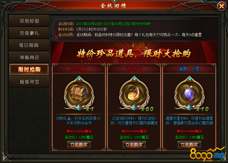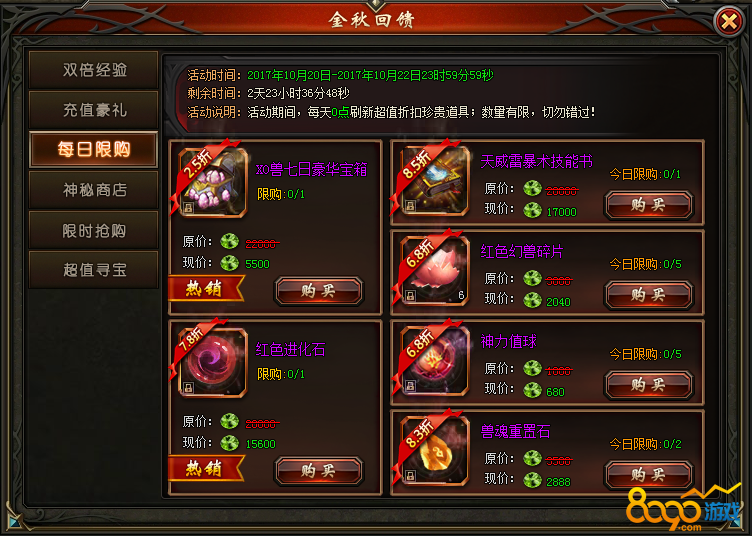 活动说明:活动期间,每天0点刷新超值折扣珍贵道具;每份道具有限购次数;