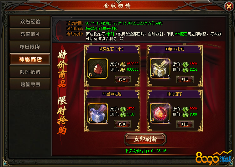 活动说明:活动期间,商店物品每2小时(或商品全部已购)自动刷新,亦可消耗199魔石立即刷新,每次刷新后每样物品限购1次;可使用多种货币购买极品珍品奖励!