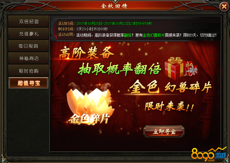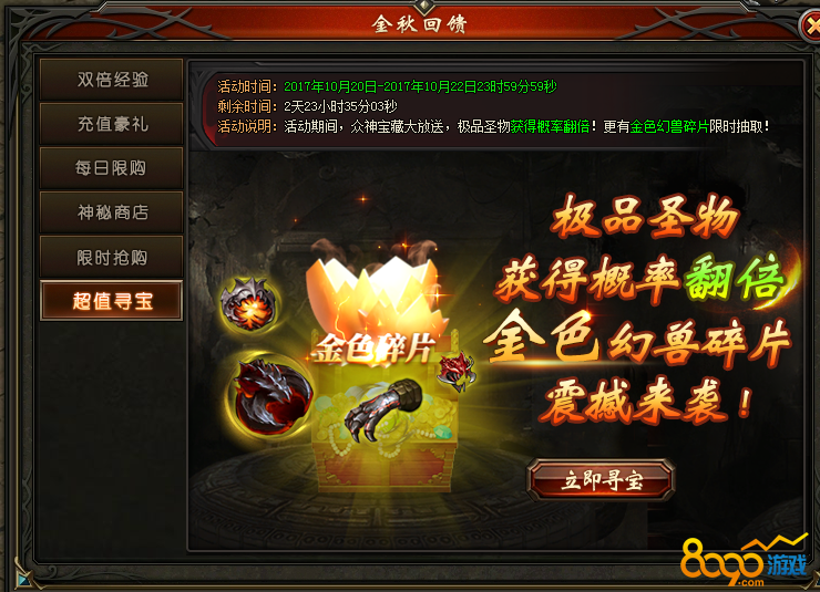 活动说明:活动期间,金色幻兽碎片限时抽取!极品圣物抽取概率翻倍,活动只限时3天