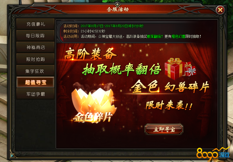 活动说明:活动期间,高阶装备抽奖概率翻倍, 更有金色幻兽碎片限时抽取