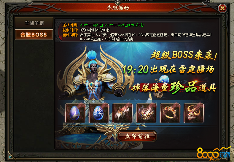 活动说明:合服第4天19:20在雷霆疆场刷新超级boss,击败boss可掉落海量奖励;boss每次出现,10分钟后消失;