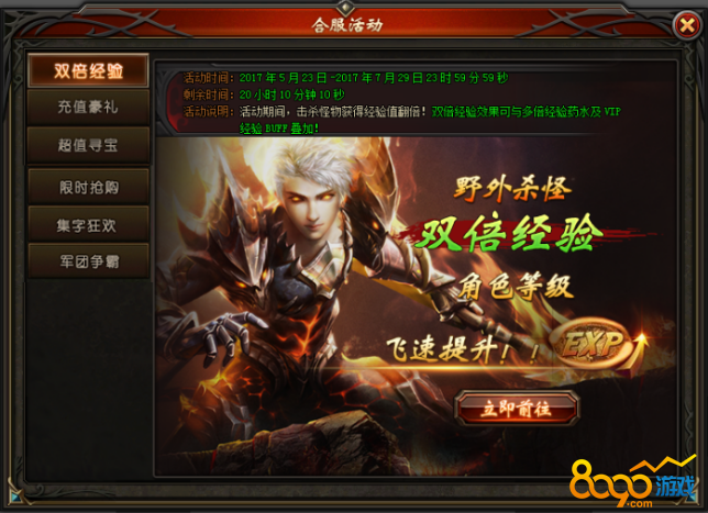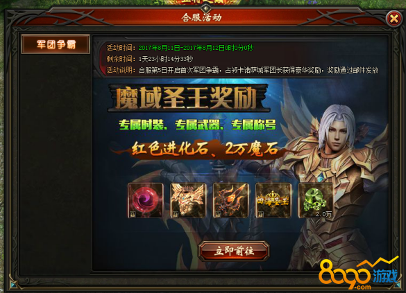 活动说明:合服第5天晚上20:00开启本服第一场军团争霸战,成功占领雷霆疆场的军团长即为卡诺萨城主,可以领取红色进化石、20000魔石奖励!