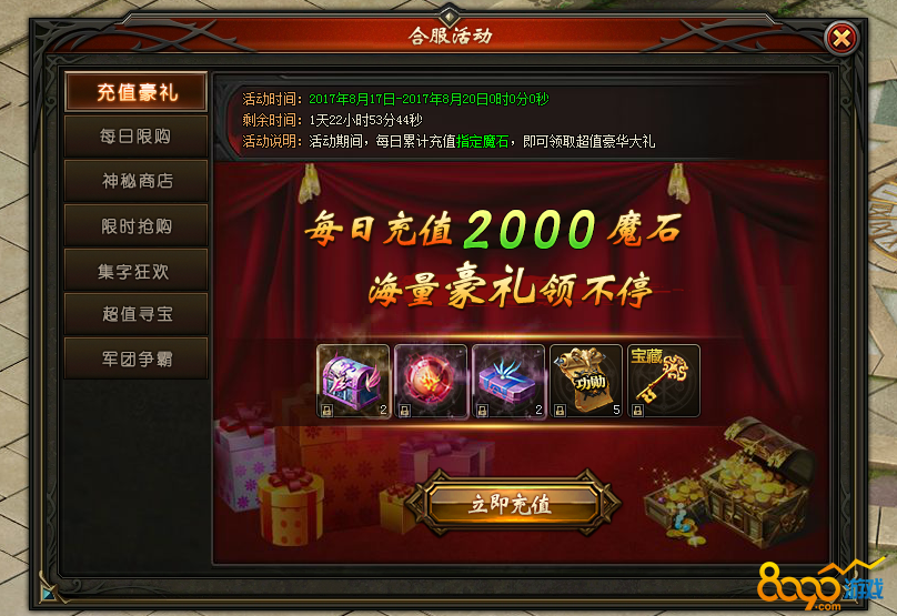 活动说明:活动期间,每日累计充值达到指定魔石数量,即可领取超值豪华大礼