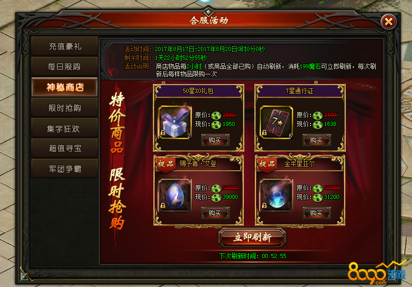 活动说明:活动期间,商店物品每2小时(或商品全部已购)自动刷新,亦可消耗199魔石立即刷新,每次刷新后每样物品限购1次;可使用多种货币购买极品珍品奖励!