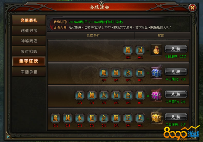 活动说明:活动期间,击败100级以上boss可掉落文字道具,文字组合可兑换相应大礼;每日0点重置限兑次数