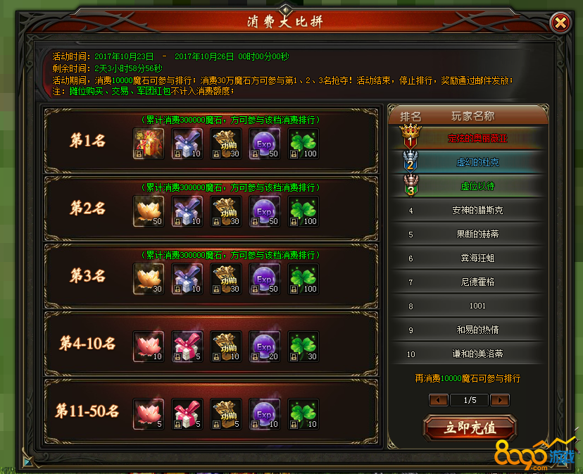 活动说明:活动期间,消费10000魔石可参与排行,消费30万魔石方可参与第1、2、3名抢夺!活动结束,停止排行,奖励通过邮件发放