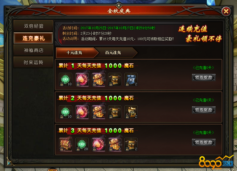 活动说明:活动期间,累计3天每天充值10元、100元即可领取对应奖励!