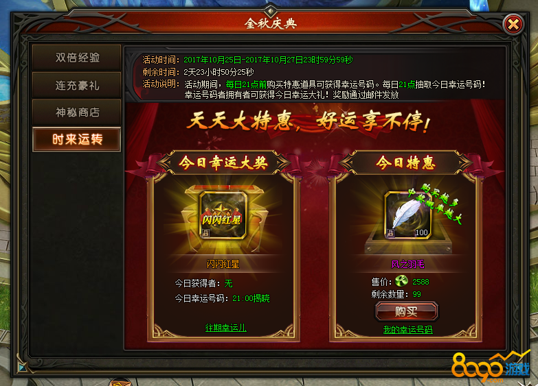 活动说明:活动期间,每日21点前购买特惠道具可获得号码;每日21点抽取今日幸运号码,幸运号码拥有者可获得今日幸运大礼,奖励通过邮件发送!