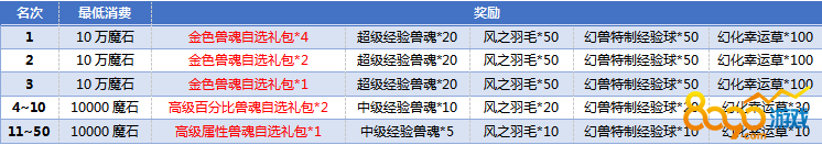 活动说明:自活动生效起,消费10000魔石可参与排行;消费10万魔石方可参与第1、2、3名抢夺!活动结束,停止排行,奖励通过邮件发放;
