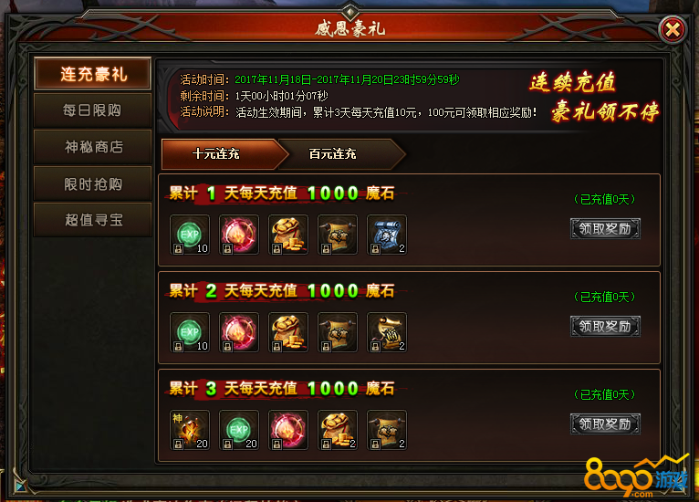 活动说明:活动期间,累计3天每天充值10元、100元可领取对应奖励!