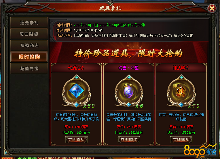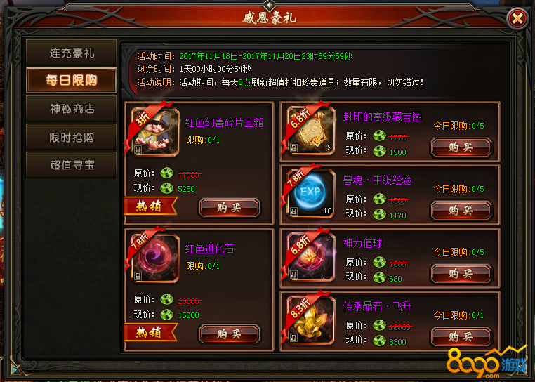 活动说明:活动期间,每天0点刷新超值折扣珍贵道具! 数量优先,切勿错过