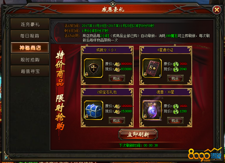活动说明:活动期间,商店物品每2小时(或商品全部已购)自动刷新,亦可消耗199魔石立即刷新,每次刷新后每样物品限购1次;可使用多种货币购买极品珍品奖励!