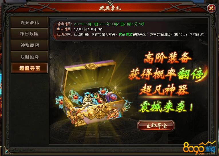 活动说明:活动期间,众神宝藏大放送,极品神器、金色幻兽碎片震撼来袭!限时4天,切勿错过!