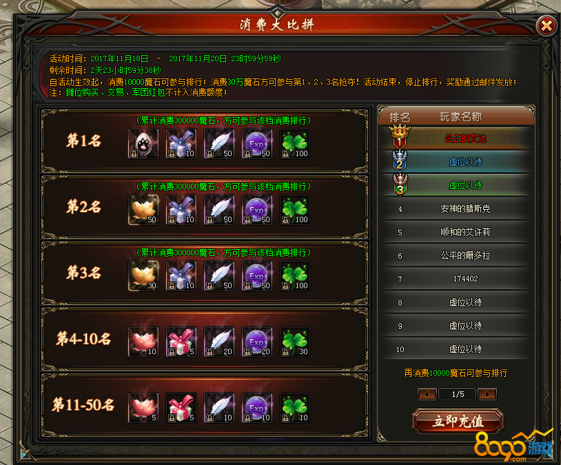 活动说明:自活动生效起,消费10000魔石可参与排行;消费30万魔石方可参与第1、2、3名抢夺!活动结束,停止排行,奖励通过邮件发放;