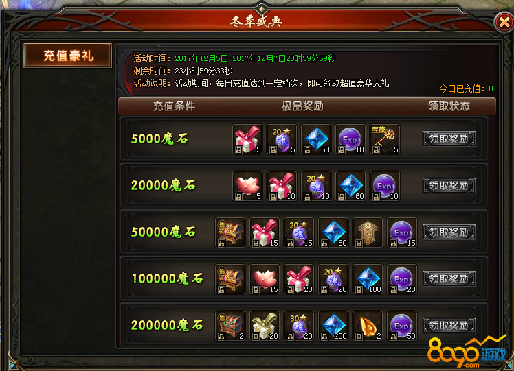 活动说明:活动期间,每天充值达到指定魔石可领取对应奖励!