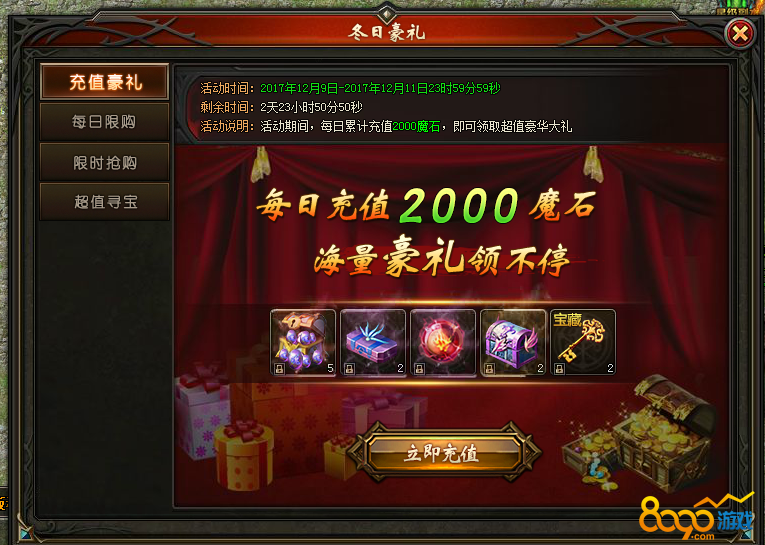 活动说明:活动期间,每日累计充值2000魔石,可领取超值豪华大礼