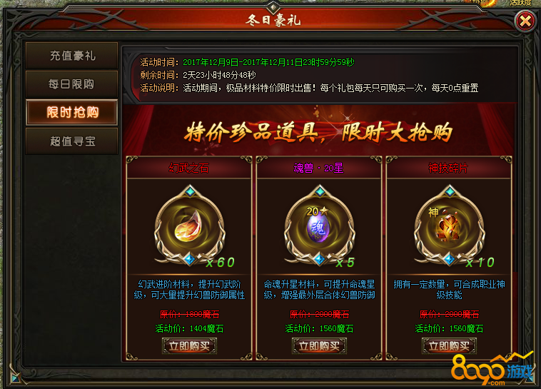 活动说明:活动期间,每天0点刷新超值折扣珍贵道具! 数量优先,切勿错过