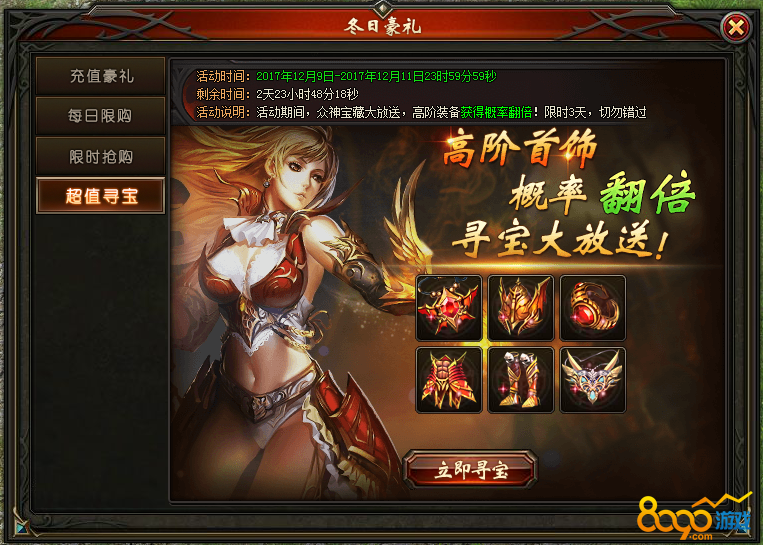 活动说明:活动期间,众神宝藏大放送,极品神器震撼来袭!高阶装备抽取概率翻倍,限时3天,切勿错过!