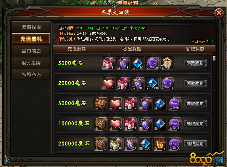 活动说明:活动期间,每日达到一定档次可领取活动奖励