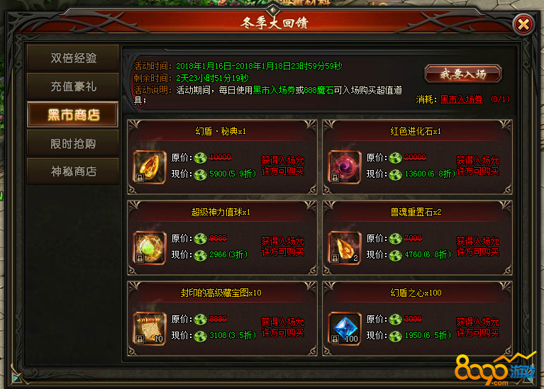 活动说明:活动期间,每日使用黑市入场券或888魔石可入场购买超值道具;