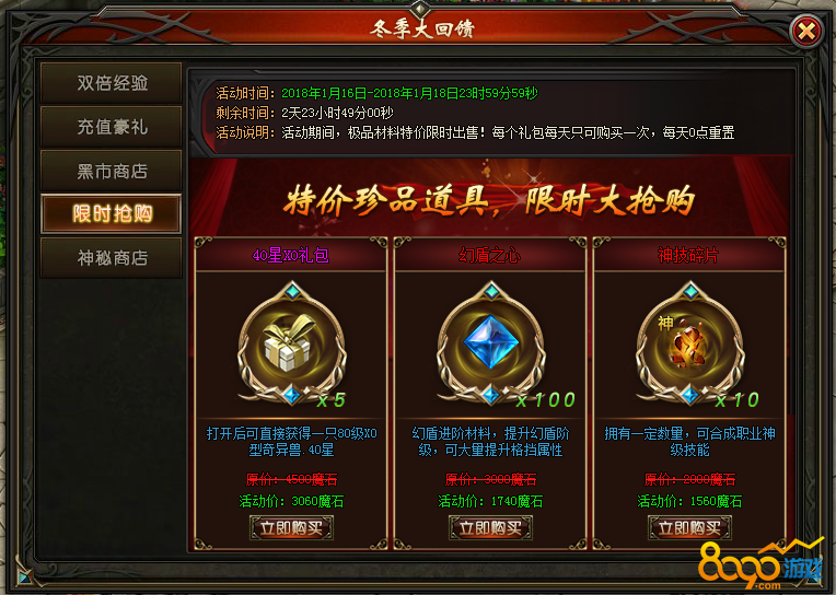 活动说明:活动期间,极品材料特价限时出售!每个礼包每日只可购买一次,每日0点重置