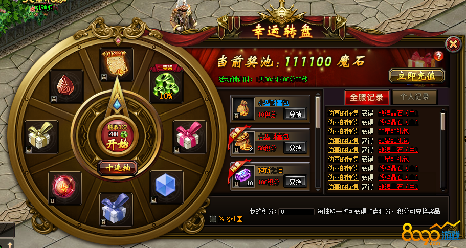 2. 转动转盘可获得珍品奖励,幸运儿还可获得一定额度奖池中的魔石!
