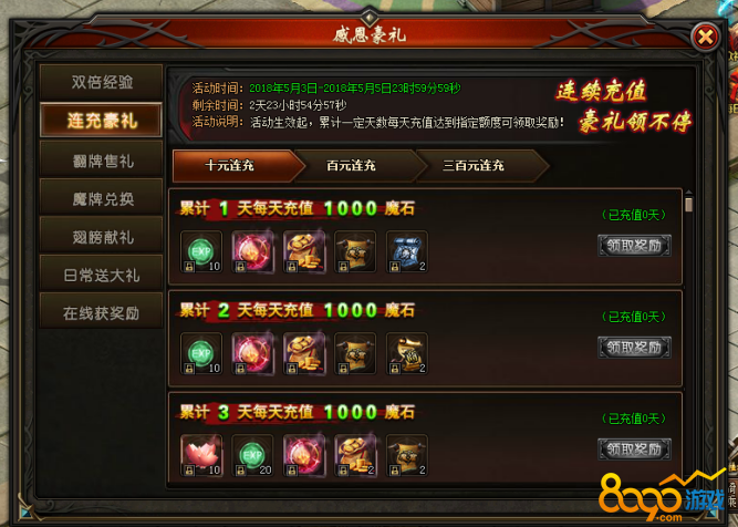 活动说明:活动期间,累计3天每天充值10元、100元、300元可领取对应奖励!