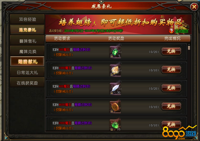 活动说明:活动期间,翅膀到指定阶数且消耗少量魔石可领取活动奖励,阶数越高,奖励越丰厚!