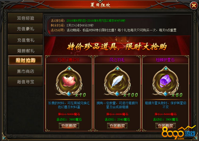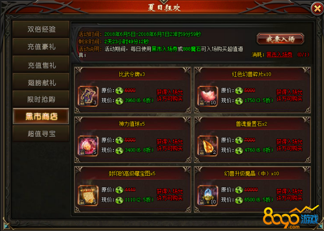 活动说明:活动期间,每日使用黑市入场券或888魔石可入场购买超值道具;