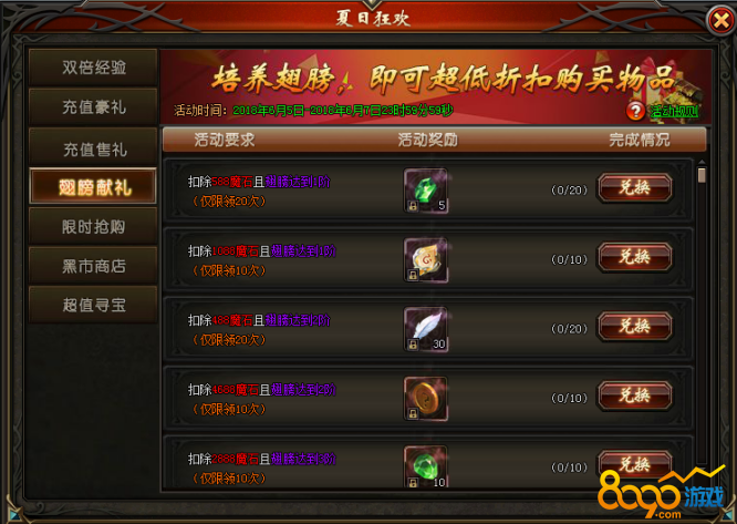 活动说明:活动期间,翅膀到指定阶数且消耗少量魔石可领取活动奖励,阶数越高,奖励越丰厚!