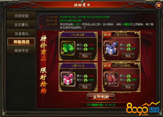 活动说明:商店物品每2小时(或商品全已购)自动刷新,消耗199魔石可立即刷新,每次刷新后每样物品限购1次