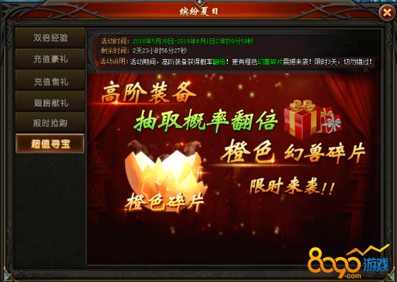 活动说明:活动期间,高阶装备获得概率翻倍, 更有橙色幻兽碎片限时抽取!