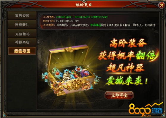 活动说明:活动期间,极品神器限时抽取!装备抽取概率翻倍,活动只限时3天